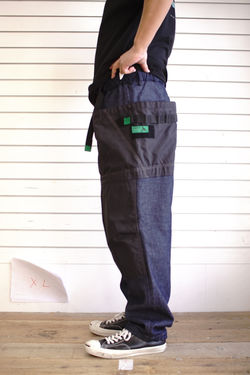 もはやH.A.K.Uの代名詞となったビッグポケット【 HANDSFREE POCKET 】その名の通り「両手を開放する」為のポケットデザイン。そのデザインは欧米のペインター(塗装職人)のパンツから着想を得、大ぶりのツールポケットや刷毛や筆をホールドするデイジーチェーン、作業中の汗を拭くタオルをひっかけるスラウチループなど。木工職人や、看板を手書きするサインペインターの作業をイメージしながら必要となる収納ポケットをデザインしました。ポケットの袋布にはオリジナル難燃素材ダイナモナスを使用。難燃性だけではなく摩擦強度も秀でて強く、ラフに道具を突っ込んでも破れにくく安心の強度。ハンマーやペグ、グローブやナイフ、IPADの様なデバイスや、農作業中の収穫した野菜や道具だって入れられる。濡れたり泥で汚れたりしても気にしない。左側にはデイジーチェーンなんでも引っ掛けてガシガシ使える。まるでウェアラブルバッグ=「カバンを穿いているかの様な収納力」そんなオーバースペックを楽しむパンツです。