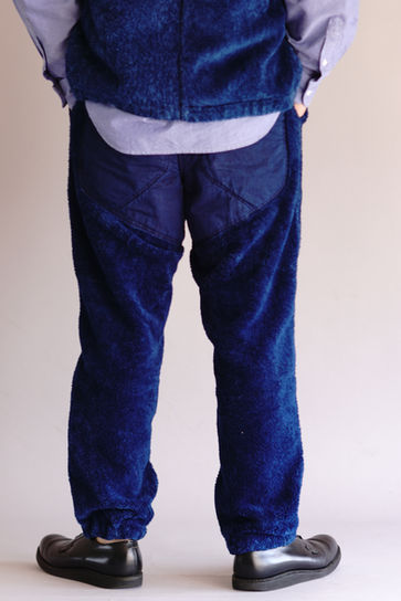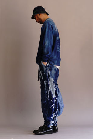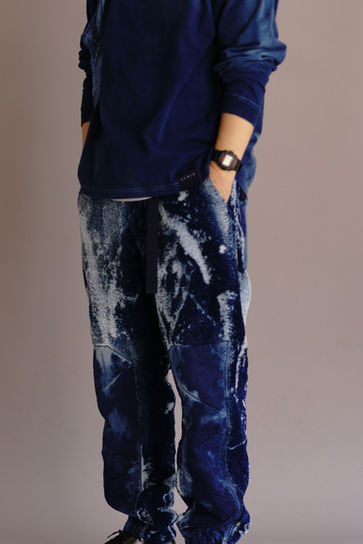 ウエストはウェービングベルト テープ先にはウーブンネーム。膝とヒップはコットンナイロンの別布。 右ヒップポケット内部にはフィックスドポケット装備。 インディゴ製品染め。 シルエットはゆったりしているが裾はすっきりテーパード。 IG:製品インディゴ染め。 MF:製品インディゴ染め+ハンド抜染