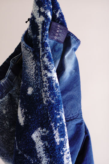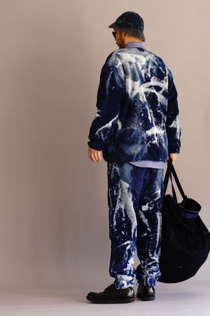 ノーカラージップジャケット,ボディーは全面ブランケット表面素材使いで裾のポケットは綿ナイロンの別布使い、 ややゆったり目のサイズ感、ワイド目の身巾にコンパクトな着丈。 IG:製品インディゴ染め。 MF:製品インディゴ染め+ハンド抜染